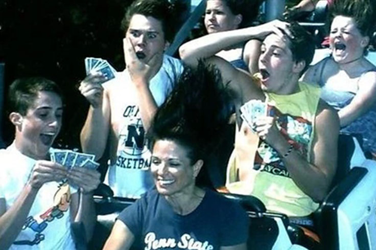 The woman in front, oblivious to the game, displayed the classic thrill-seeker’s smile, while the boys behind her held their cards tight, trying to maintain their composure amidst the roller coaster’s twists and turns. This hilarious juxtaposition of activities made the moment even more entertaining.