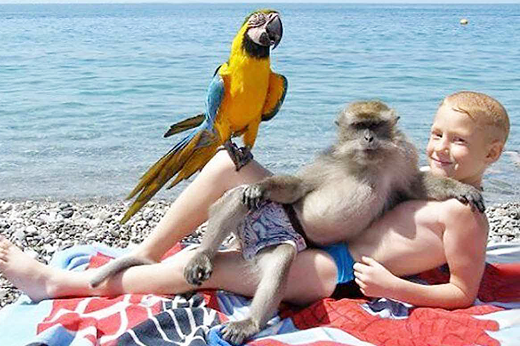 In a peaceful beach setting, a young child, a monkey, and a parrot are all relaxing together. It could almost be the start of a rather odd joke. We’re really curious about how they managed to get such a perfect pose for this photo. Whoever did it must be really good at handling both animals and children!