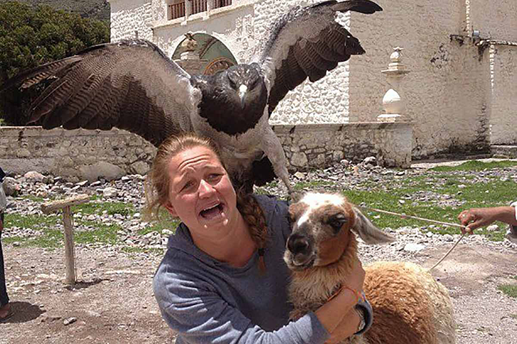 It’s very likely that the owl didn’t mean to startle her so much, and now she has an unexpected new companion! When it comes to making friends, having a bird of prey as a buddy isn’t too bad… as long as you’re not its target, of course! That moment might have been a bit scary, but the result is a great photo and an unforgettable vacation memory.