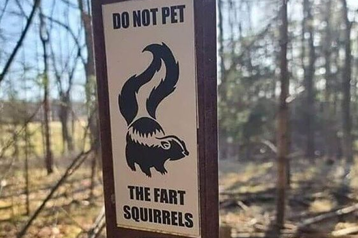 Working at a park seems to require a good sense of humor, as evidenced by this park sign. It cautions visitors against petting the “fart squirrels,” complete with an image of a skunk. It’s an amusingly apt description when you think about it. Surprisingly, it seems that skunks might approach people close enough to be petted, contrary to what you might expect of wild animals, which are typically wary of humans.
