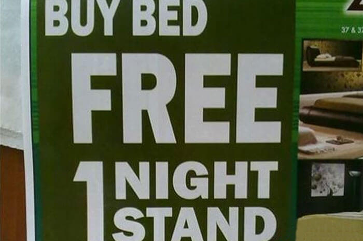 While furniture shopping, someone stumbled upon this confusingly arranged set of words. It says, in this exact order: “Buy Bed Free 1 Night Stand.” We assume it’s intended to mean that you get a free nightstand, as in a table, when you purchase a bed. However, it’s easy to interpret this phrase in a completely different way. We’ll leave it to you to work out that interpretation—hint: it’s definitely something they shouldn’t be advertising.