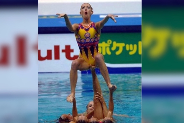 This perfectly captured pool moment shows one swimmer’s valiant—if slightly misguided—attempt to stabilize her teammate. The bottom athlete’s supportive foot placement was clearly meant to help, but the look of sheer surprise on the top swimmer’s face suggests this “rescue mission” took an unexpected turn! Her wide-eyed expression and mid-flail arms tell the whole story: “That is NOT where I thought the assist was coming from!”