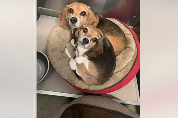 These two beagles are the epitome of companionship as they cuddle up together in their cozy bed at the vet’s office. Their close bond is evident as they find comfort in each other’s presence. With their soulful eyes and gentle expressions, they remind us of the special connection between pets and their families.