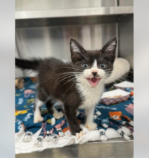 This tiny black and white kitten has a lot to say! With its mouth open wide, it’s clearly expressing its thoughts to anyone who will listen. The kitten’s bright blue eyes and tiny paws add to its irresistible cuteness, making it a favorite among staff and visitors.