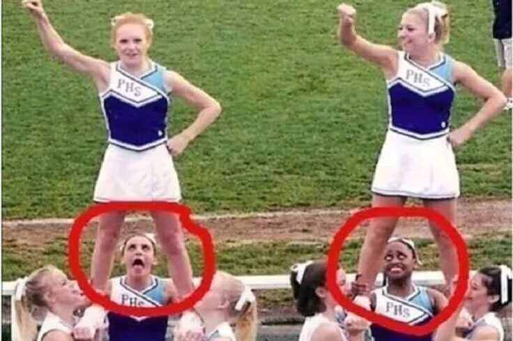The best thing about this picture is the fact that both cheerleaders are in the exact boat but their facial expressions are complete opposites. Whatever the case may be, they both seem to be scarred for life from their ordeal. Nobody said cheerleading was easy.