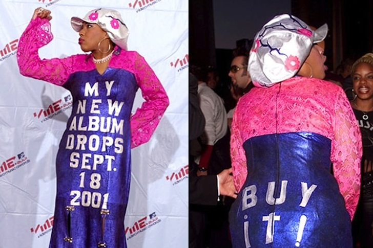 At the 2001 MTV Video Music Awards, Macy Gray turned heads not just with her voice but with her fashion. She donned a dress that doubled as a walking advertisement, boldly announcing, “My new album drops September 18, 2001,” with a cheeky “Buy It” command on the back.